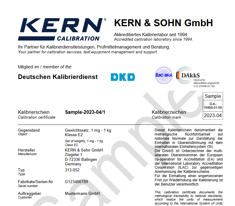Das DAkkS-Kalibrierlaboratorium KERN (D-K-19408-01-00) ist akkreditiert durch die Deutsche Akkreditierungsstelle GmbH. Der DAkkS-Kalibrierschein wird international anerkannt und ist in vielen Sprachen erhältlich.